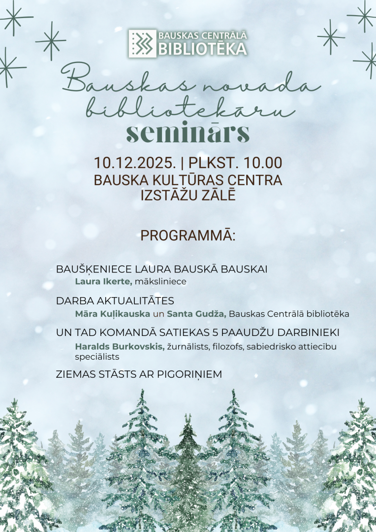 Bauskas Centrālā bibliotēka organizē Bauskas novada bibliotekāru semināru, kas norisināsies 2025. gada 10. decembrī Bauskas Kultūras centra Izstāžu zālē.