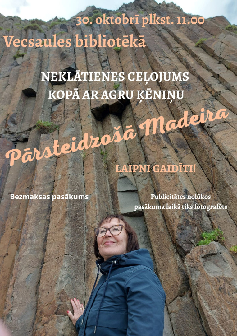 2025. gada 30. oktobrī plkst. 11.00 Vecsaules bibliotēka aicina uz tikšanos ar Agru Ķēniņu, lai kopā ar viņu iepazītu pārsteidzošo Madeiru, tās kultūru, tradīcijas, dabu, cilvēkus.