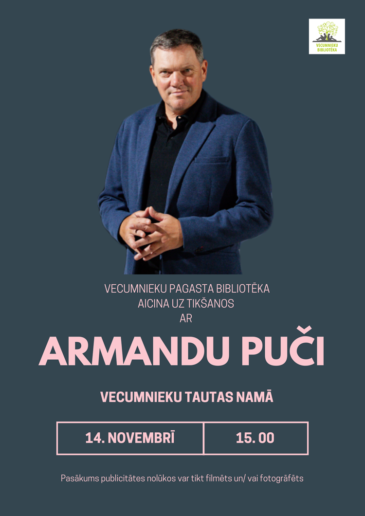 2025. gada 14. novembrī plkst. 15.00 Vecumnieku pagasta bibliotēka aicina uz tikšanos ar Armandu Puči Vecumnieku tautas namā.