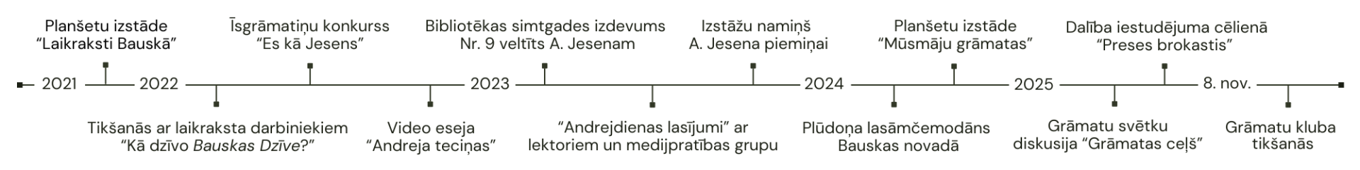Bauskas Centrālā bibliotēka atsaukusies Latvijas Nacionālās bibliotēkas aicinājumam būt par vienu no ziņnešiem norišu kopā “Latviešu grāmatai 500”. Gaidot valodai un grāmatniecībai zīmīgo 2025. gadu, kad pirmajai latviešu valodā drukātajai grāmatai aprit puse tūkstošgades, kopā ar Latvijas Nacionālo bibliotēku un Bauskas novada bibliotēkām realizētas vairākas ieceres. Šis piecgades cikls, kas nupat kā iegājis finiša taisnē, cildinājis drukātā vārda nozīmi un bijis notikumiem bagāts. Domāts gan par bērnu un jauniešu, gan pieaugušo auditoriju. Mēs sākām ar planšetu izstādi "Laikraksti Bauskā" veidošanu 2022. gadā, un noteikti pievienosimies svinībām 2025. gadā.