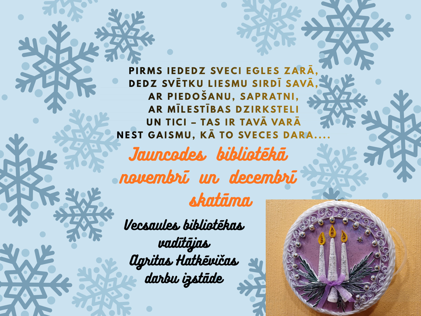 2025. gada novembrī un decembrī Jauncodes bibliotēkā skatāmi Vecsaules pagasta Vecsaules bibliotēkas vadītājas Agritas Hatkēvičas 12 darinātie darbiņi kvilinga tehnikā.