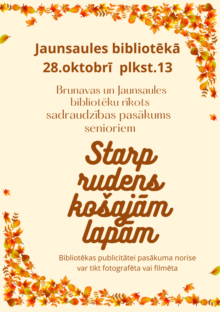 2025. gada 28. oktobrī plkst. 13.00 Jaunsaules bibliotēkā sadarbībā ar Brunavas bibliotēku norisināsies sadraudzības pasākums "Starp rudens košajām lapām" Brunavas un Jaunsaules senioriem.