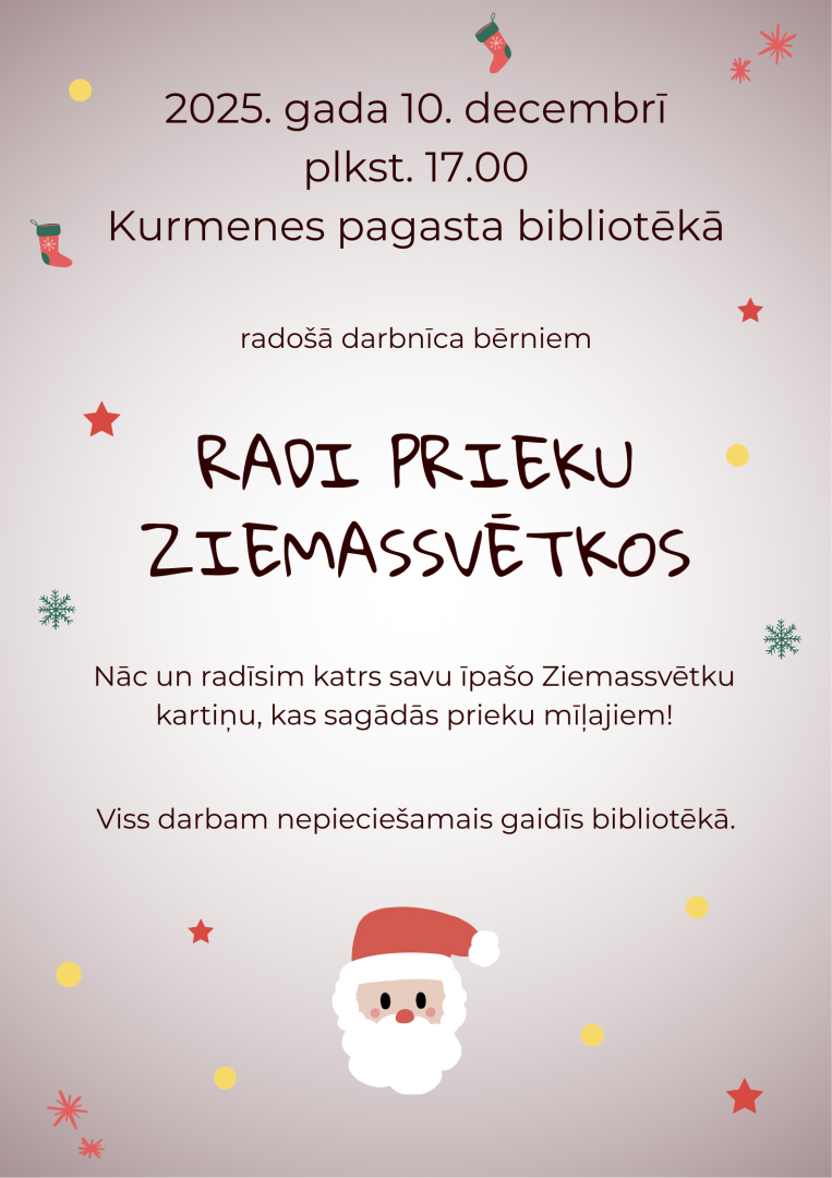 2025. gada 10. decembrī plkst. 17.00 Kurmenes pagasta bibliotēka aicina uz radošo darbnīcu bērniem “Radi prieku Ziemassvētkos”, kur kopīgi radīsim katrs savu īpašo Ziemassvētku kartiņu.