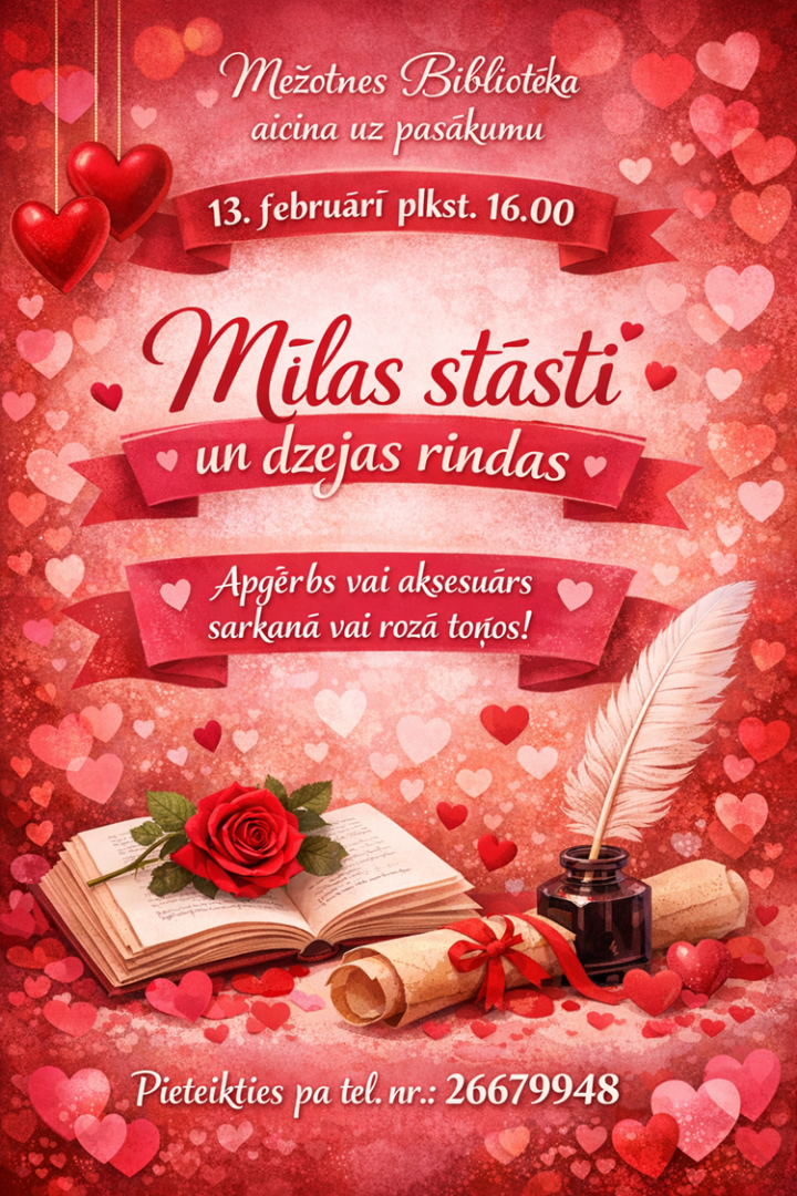 2026. gada 13. februārī plkst. 16.00 Mežotnes bibliotēka aicina uz pasākumu "Mīlas stāsti un dzejas rindas".