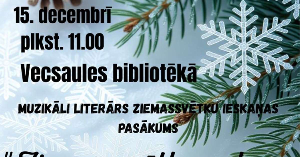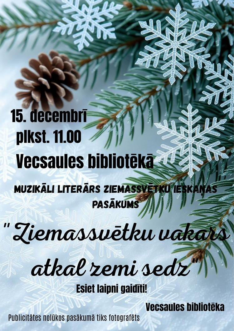 2025. gada 15. decembrī plkst. 11.00  Vecsaules bibliotēka aicina uz muzikāli literāru Ziemassvētku ieskaņas pasākumu "Ziemassvētku vakars atkal zemi sedz".