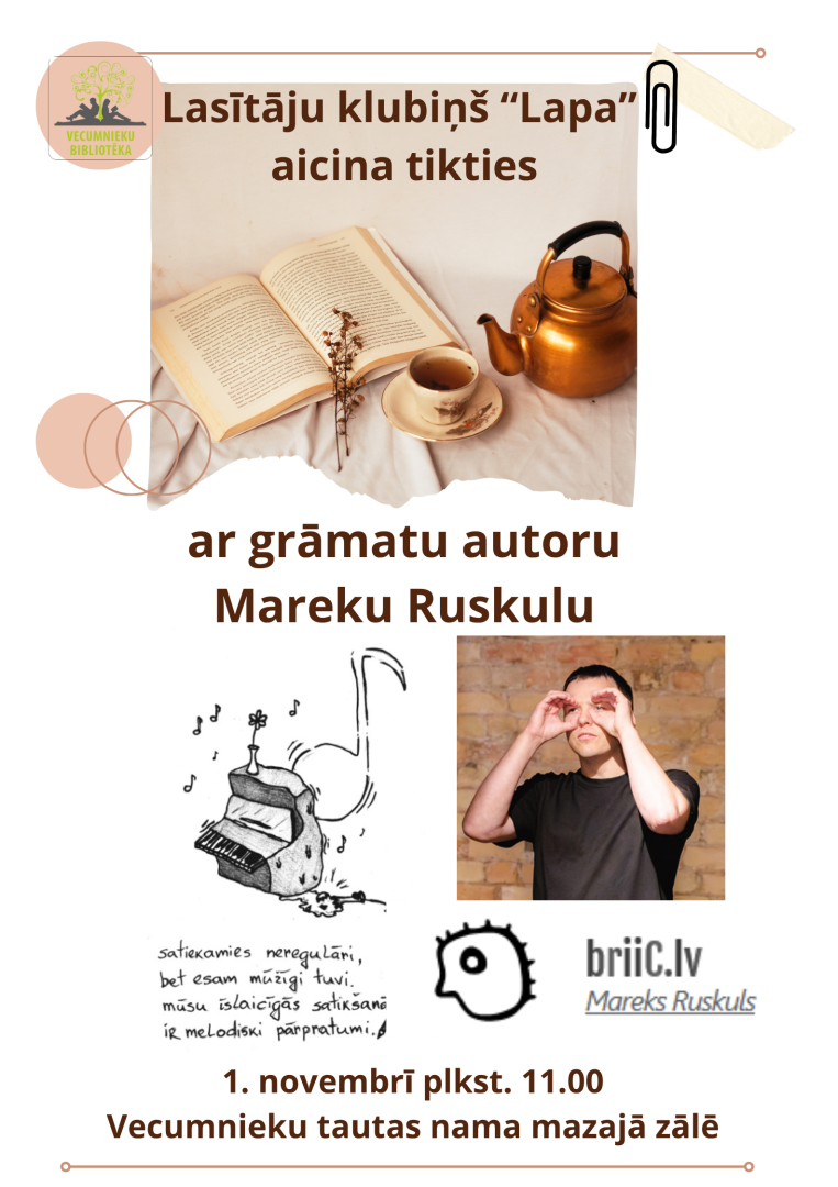 2025. gada 1. novembrī plkst. 11.00 Vecumnieku bibliotēkas lasītāju klubiņš "Lapa" aicina uz tikšanos ar grāmatu autoru Mareku Ruskulu.