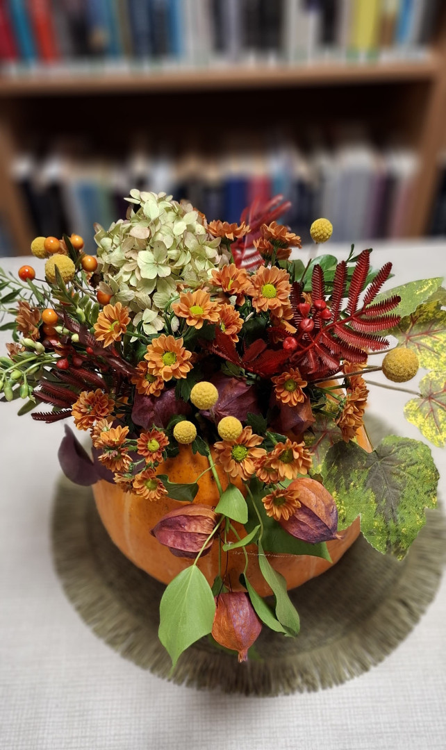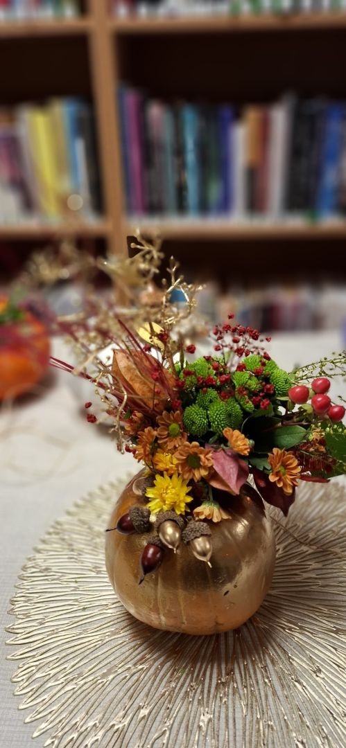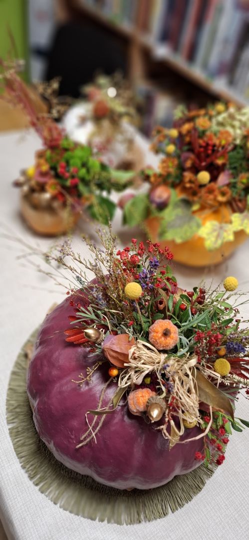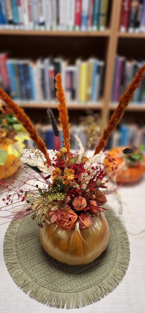 2025. gada 28. oktobra vakarā bibliotēkā valdīja rudens krāsām un radošuma piepildīta gaisotne. Bērni un pieaugušie piedalījās radošajā darbnīcā, kur no ķirbjiem tapa skaistas un oriģinālas rudens kompozīcijas.