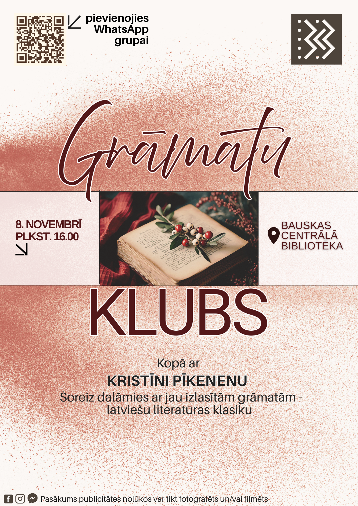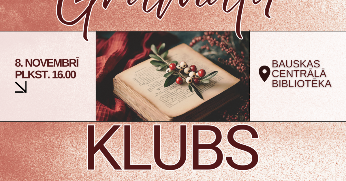 2025. gada 8. novembrī plkst. 16.00 literatūras mīļotāji aicināti tikties Grāmatu klubā Bauskas Centrālajā bibliotēkā.